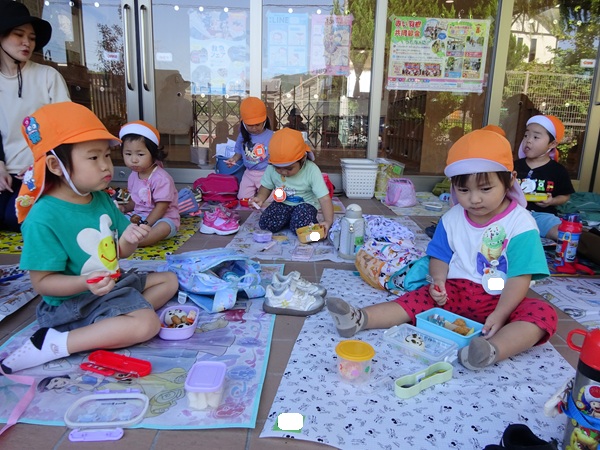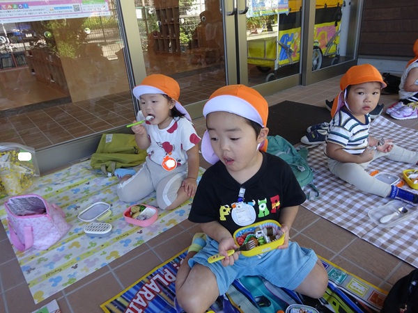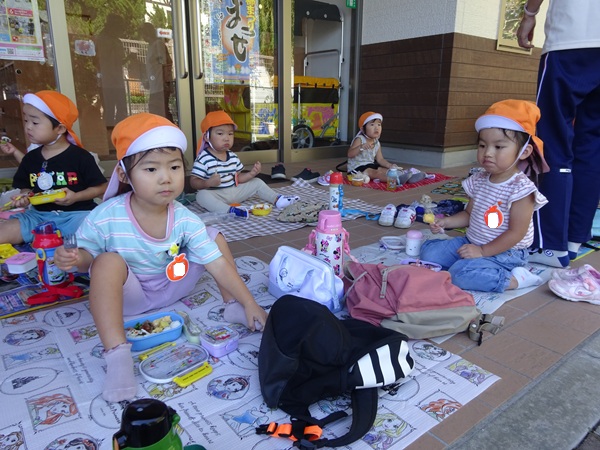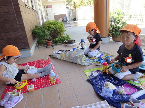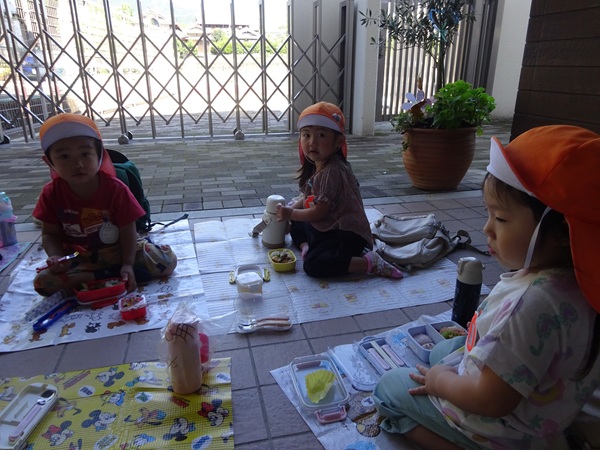 こども園の玄関の涼しいところでお弁当を食べました